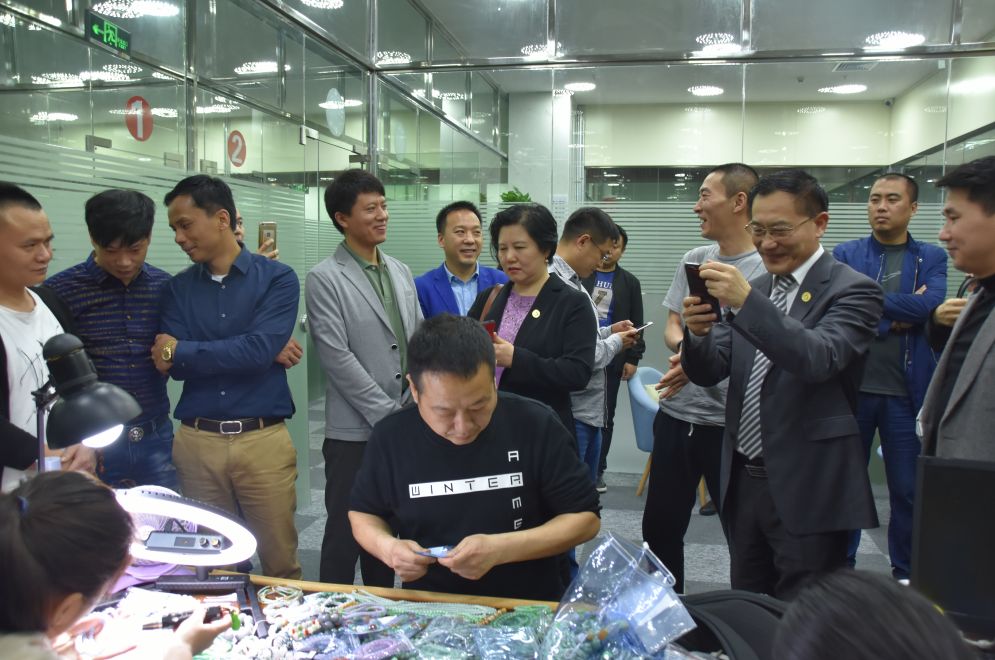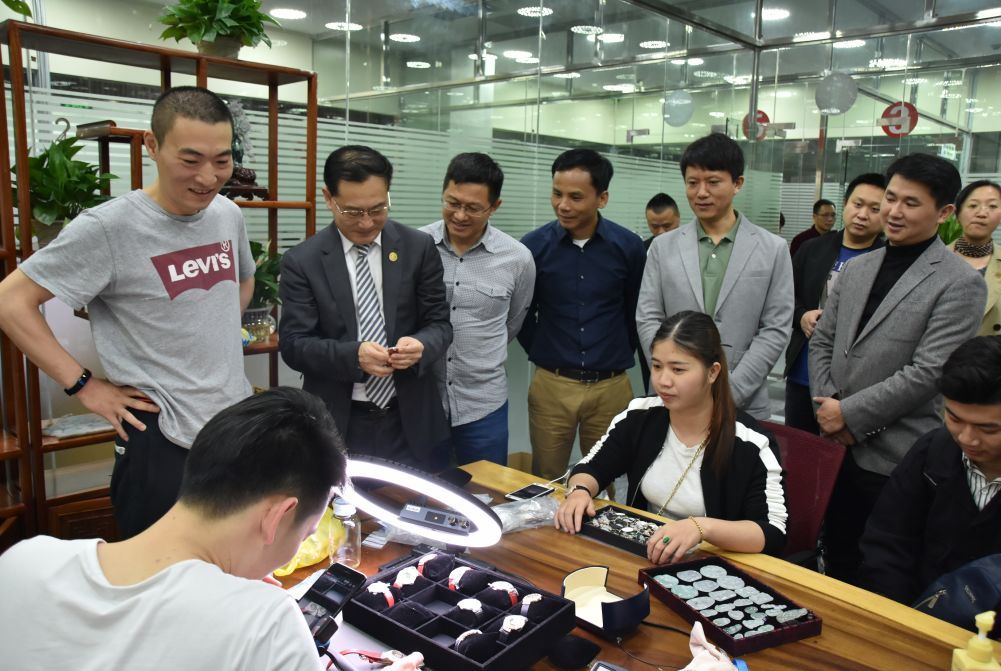 在臧总的陪同下,中宝协领导一行旅行了玉博城一层、二层、三层的翡翠市场,兴致勃勃地旅行了商城内挂饰、摆件等琳琅满目、种类繁多的翡翠精品。电商直播作为翡翠行业新兴的营销方法颇受商家青睐。毕立君秘书长还特意旅行了商城二层电商直播区,并与电商商户亲切交谈,详细了解目今电商的生长现状及未来运营思路。